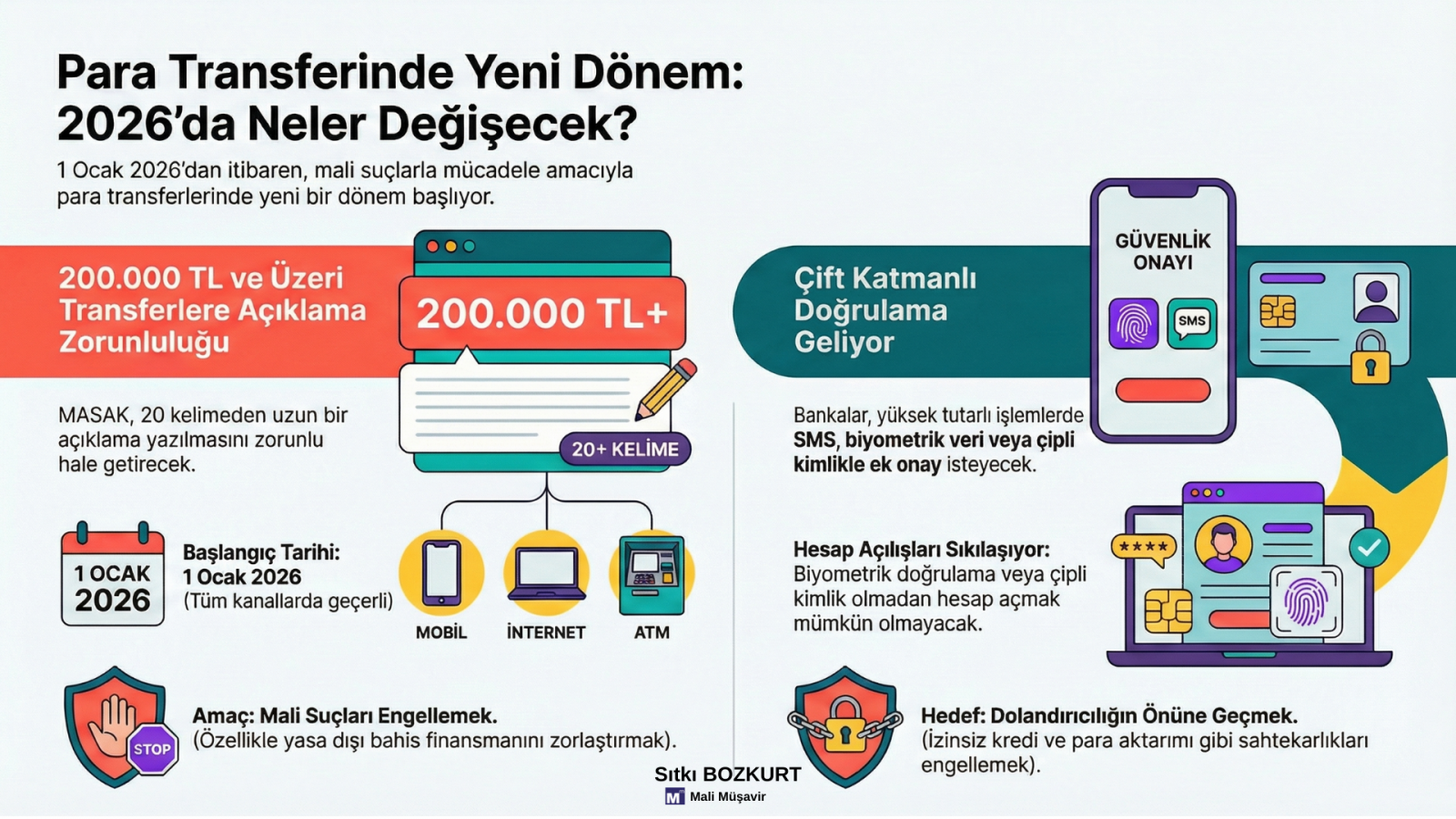 Özetle, 2026 itibarıyla finansal hayatımıza üç temel yenilik giriyor. Bu düzenlemeler, mali suçlarla üç aşamalı bir mücadele stratejisi ortaya koyuyor: Sisteme giriş noktasında biyometrik hesap açılışı ile güvenliği sağlama, yüksek değerli para hareketlerini detaylı açıklama zorunluluğu ile izleme ve işlem onay anında çift katmanlı güvenlik kalkanı ile koruma.